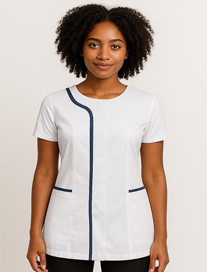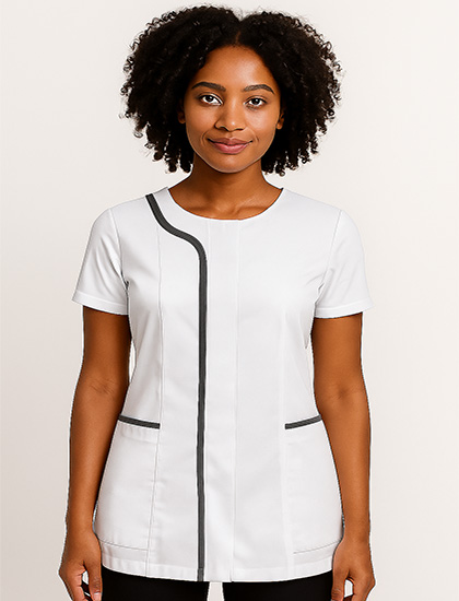 Casaca mujer blanca S/Manga, con tapeta de vivos color gris perla y azulina.